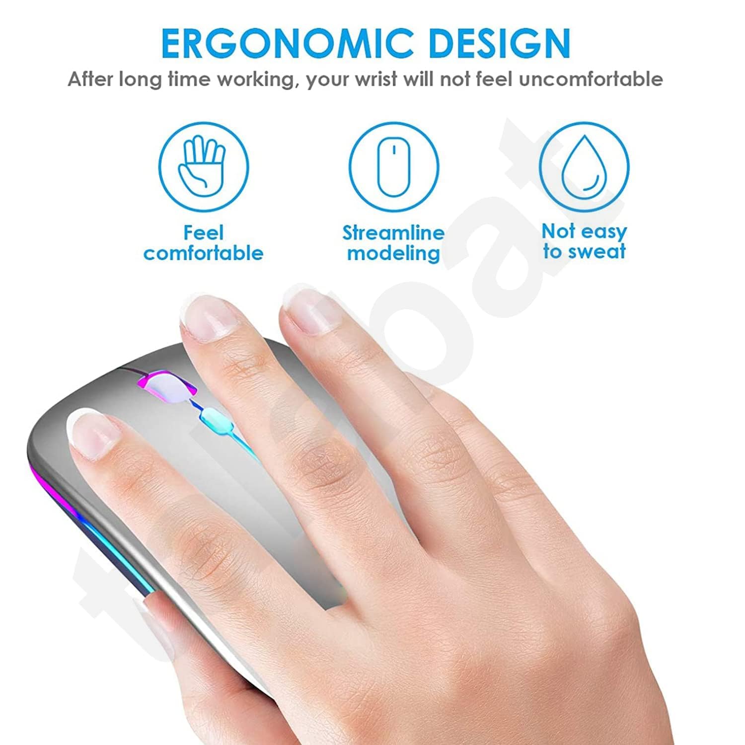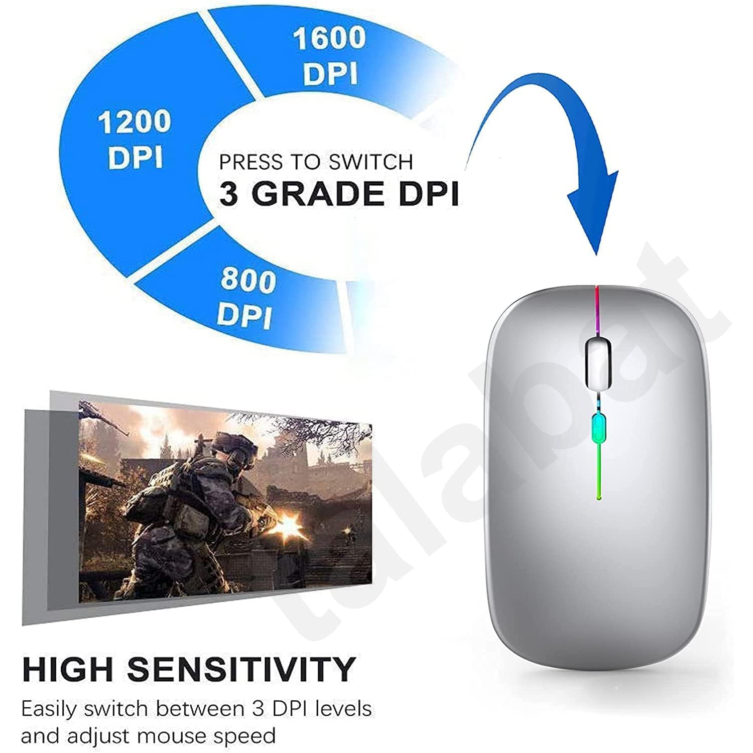 xElevate your workspace with this RGB wireless mouse, featuring customizable LED lighting for a personalized touch. Enjoy the convenience of a rechargeable battery that lasts 7-15 days on a single charge, paired with silent buttons that reduce noise by 90%, making it ideal for offices, libraries, and cafes. The plug-and-play design ensures easy setup with any device, while the 2.4GHz wireless technology provides a reliable connection up to 10 meters. With adjustable DPI settings (800/1200/1600), this mouse delivers precise tracking for all your daily tasks. Lightweight and ergonomic, it’s perfect for work and travel.
